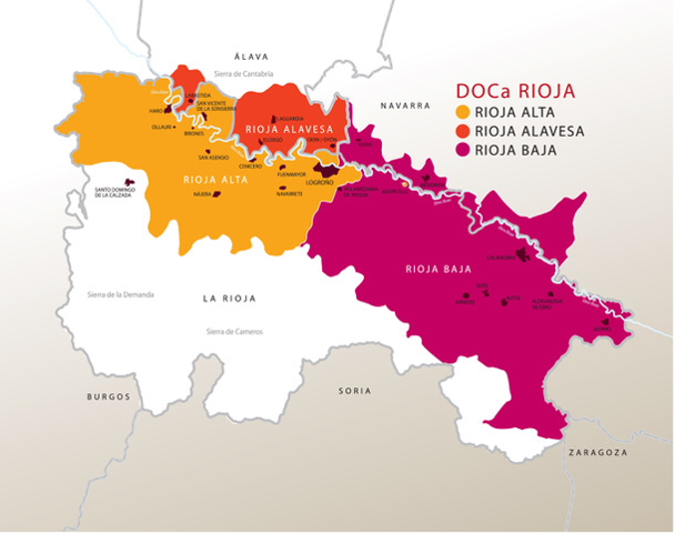 The wine producing region is divided into 3 sub-regions: Rioja Alta, Rioja Alavesa and Rioja Oriental (this name was recently changed from the name Rioja Baja) . Rioja Alavesa is located North of the Ebro river and coincides with the part of Rioja which belongs to the Spanish Basque Country. Rioja Baja is located southeast of Logrono, whilst Rija Alta is located from Logroño to Haro, South of the Ebro river.